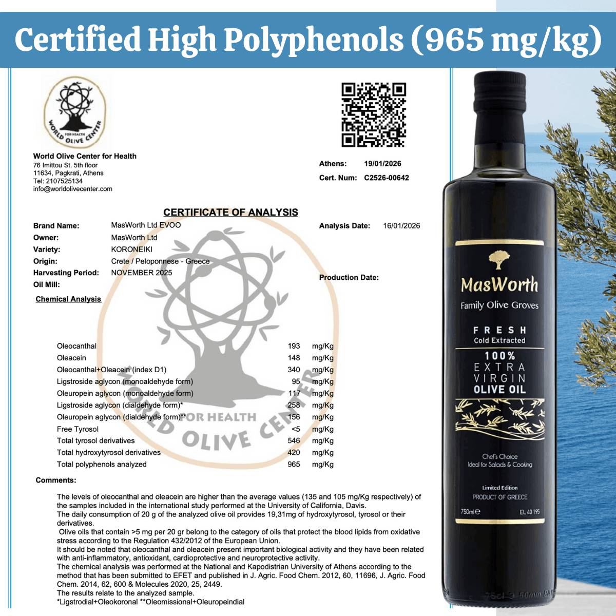 is the result of our passion and dedication to offering premium extra virgin olive oil of the highest quality and nutritional value, sourced from MasWorth family’s olive groves. We’re proud to share this exceptional oil with olive oil enthusiasts and families seeking fresh, flavorful, and healthy options for salads, cooking, and everyday meals. Hand-harvested and cold-extracted within hours of picking, MasWorth preserves its rich taste and high concentration of polyphenols (lab certified for it’s high phenolic content) – natural compounds known for their health benefits. A high polyphenol olive oil that is also delicious to include in your daily diet.